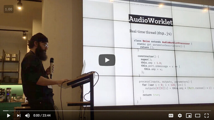 addModule()method to specify a script that can generate audio on the fly or perform arbitrary processing of audio. Various kinds of sources can now be connected through the Web Audio API to anAudioWorkletNodefor immediate processing. Source examples include anHTMLMediaElementresource, a local microphone, or remote audio. Alternatively, theAudioWorkletscript itself can be the source of audio.…The audio processing code runs on a dedicated real-time system thread for audio processing. This frees the audio from pauses that in the past might have been caused by all the other things happening in the browser.